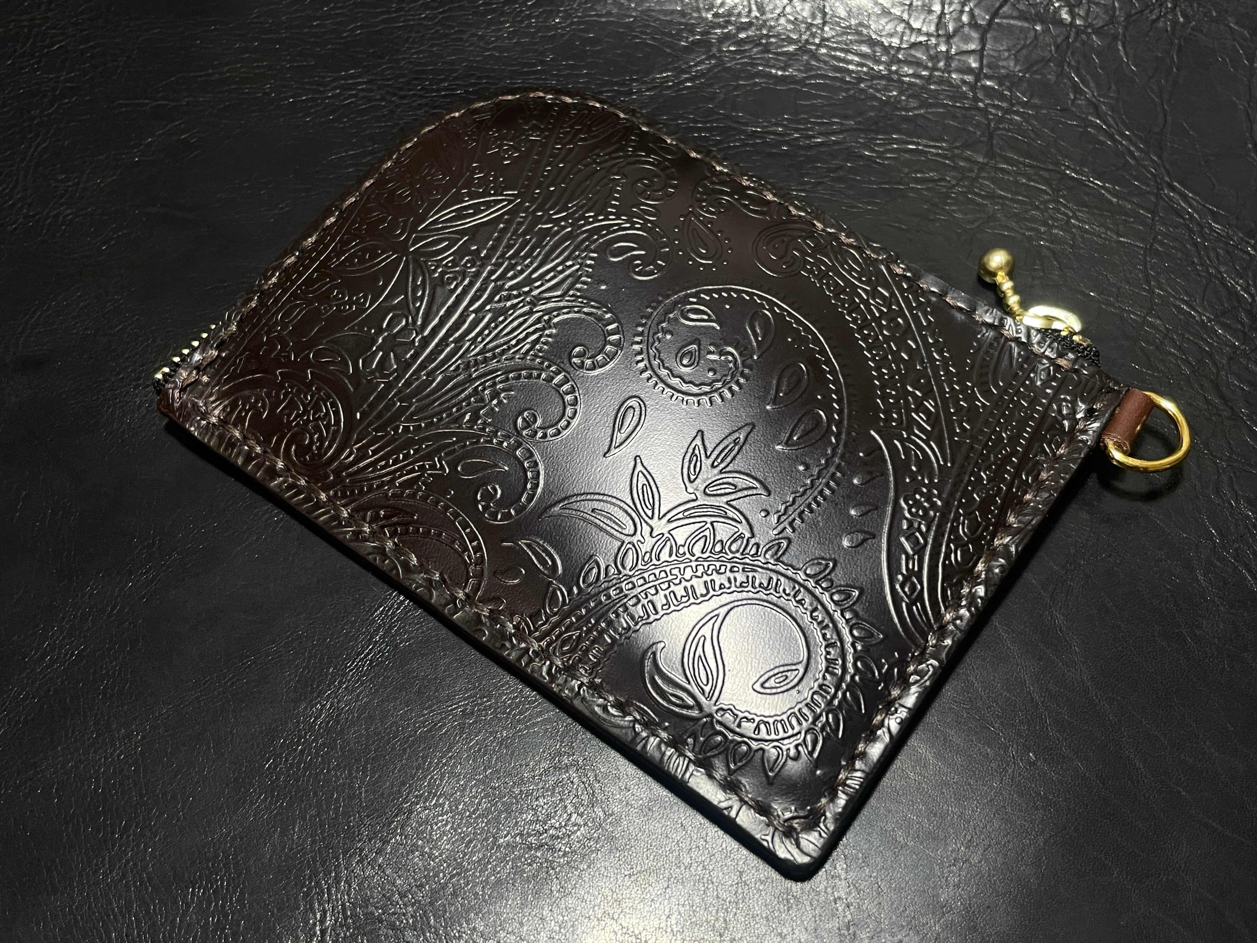 ペイズリーパターンの型押しが施されたブラウンレザーを使用したL字ファスナータイプのコンパクトウォレットになります